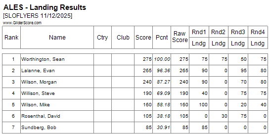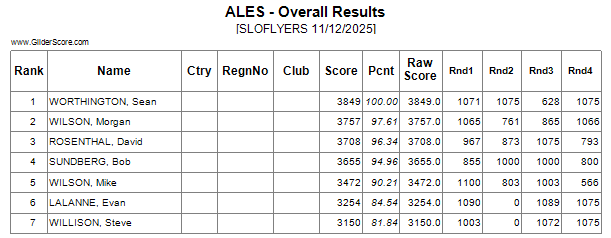 Now that was fun, one of our better contests! The morning was spectacular with a very light breeze and challenging lift. Birds helped a bit, otherwise you just had to find it. Great flying Sean and Bob.